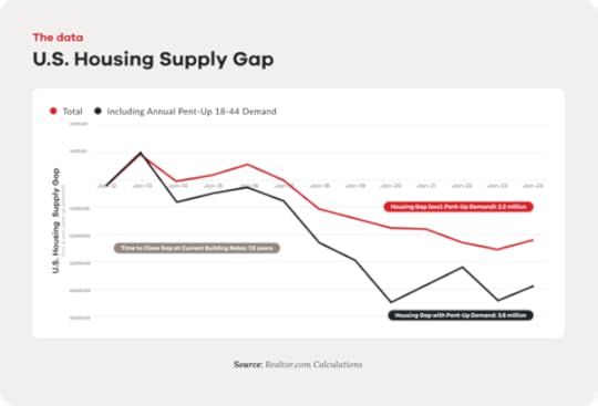 Though estimates vary, experts put the US housing shortage at somewhere between 3.7 million and 6.8 million homes. If more homes were built and demand for homes was met, then the price of homes would fall or stop rising and incomes would start to close the gap on affordability. But at the current rate of build, it would take 7.5 years to close the current housing gap – in other words, never.