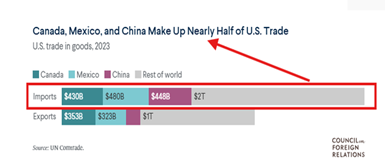 In effect, tariffs are a tax on imported goods, which the US treasury can pocket. A 25% tariff on Canada and Mexico would raise costs for US automakers. This tariff is set to add up to $3,000 to the price of some of the 16 million cars sold in the US each year. Food costs would rise as well, with Mexico supplying over 60% of fresh produce to the US.