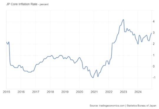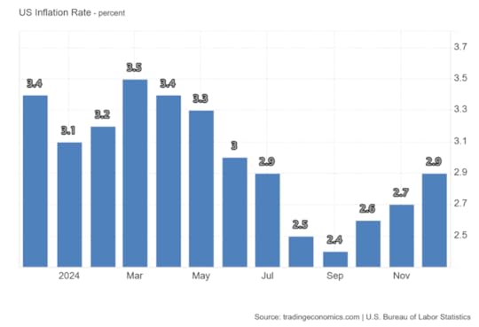 Within the US, if the tariff increases are followed through, domestic prices will rise and there will be upward pressure on inflation. There is a counteracting factor. If the US dollar increases in strength against other trading currencies, then the dollar cost of imports will be lower, reducing the price impact of the import tariffs. But most likely, the US inflation rate will head upwards. Inflation is already starting to rise again. Tariff increases will send the rate above 3% in 2025.