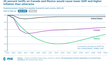 Those countries subject to Trump’s tariff increases will be hit hard. The Peterson Institute reckons that “for the duration of the second Trump administration, US GDP would be around $200 billion lower than it would have been without the tariffs. Canada would lose $100 billion off a much smaller economy, and at its peak, the tariff would reduce the size of the Mexican economy by 2 percent relative to its baseline forecast.” Indeed, JP Morgan economists reckon these measures could push both Canada (already weak) and Mexico into an outright recession.