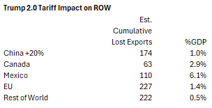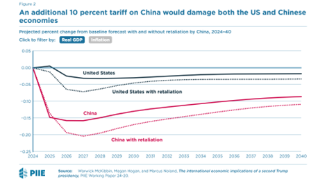 The impact on China will depend of the size of the tariff increases. At the moment, it’s only 10% but Trump has said it will eventually be 60%. If the US imposed an additional 10 percent tariff on China and China responded in kind, US GDP would be $55 billion less over the four years of the second Trump administration, and $128 billion less in China. Inflation would increase 20 basis points in the US, and after an initial dip, 30 basis points in China.