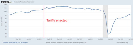 Keynesian economics blogger Noel Smith noted that Pettis reckoned that cheap Chinese imports actually made Americans poorer, by reducing their domestic production so much that Americans actually end up consuming less. Really, proclaimed Smith? “I’m highly skeptical of this argument, since a basic principle of economics is that people don’t voluntarily do things that make them poorer.” (Smith). Smith retorted that Trump’s tariffs in his first term did not boost domestic production as Pettis claimed tariffs could. Industrial production actually declined after Trump put up his tariffs: