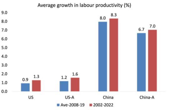 Global imbalances in trade and capital were the result of the higher productivity and technology base of the major companies in the ‘winning’ economies leading to a transfer of profits to the strong from the weak. It’s not a transfer of excess savings to excess consumption across borders; but the transfer of value and surplus value from the weaker capitalist economies to the stronger. Indeed, that is precisely the nature of imperialism: the unequal exchange of value, not a savings-consumption imbalance. Indeed, even on the adjusted (A) Western measures of labour productivity growth during the COVID period, China has done way better than the US.