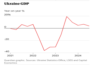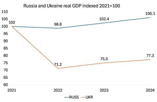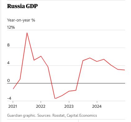 Russia’s invasion of Ukraine in early 2022 to take over the four Russian-speaking provinces in the Donbass in eastern Ukraine has ironically given a boost to the economy. In 2023, real GDP growth was 3.6% and over 3% in 2024. Russia’s war economy is holding up.