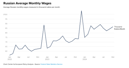 However, the war has intensified an acute labour shortage. Like Ukraine, Russia is now desperately short of people – if for different reasons. Even before the war, Russia’s workforce was shrinking due to natural demographic causes. Then at the start of the war in 2022, about three-quarters of a million Russian and foreign workers, the middle class in IT, finance, and management, left the country. Meanwhile, the Russian army is recruiting tens of thousands of working-age men. Somewhere between 10,000 and 30,000 workers join the army every month, about 0.5 percent of the total supply. That has benefited those Russian workers not in the armed forces with security of employment as managers are reluctant to let anyone go.