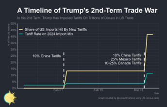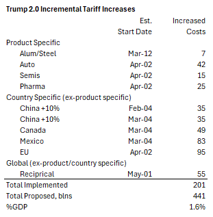 All the planned tariffs would take the US tariff rate to above 20% in just a few weeks, the highest since pre-WWI. As Joseph Politano points out, the costs of these actions are enormous, covering $1.3trn in US imports or roughly 42% of all goods brought into the United States, or the single-largest tariff hike since the infamous Smoot-Hawley Act of nearly a century ago.