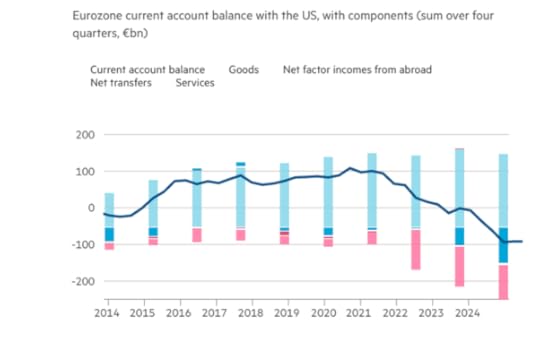 Moreover, as the Danish economist, Jesper Rangvid shows, Trump only looks only at bilateral trade in goods, ignoring trade in services and earnings from capital and labour. It so happens that the income the US derives from its exports of services at least to the Eurozone and the returns on capital and the wages of labour it has exported there offset its bilateral deficits in goods. The overall Eurozone bilateral current account balance with the US is close to zero.