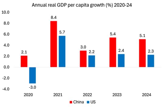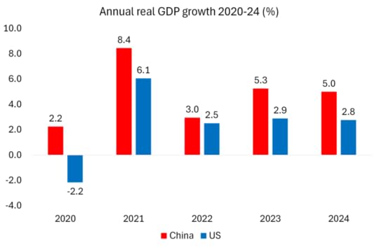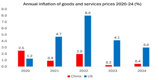 Ah, China’s Western critics say, but if you compare nominal GDP growth, which includes inflation, then US GDP rose 5.3% while China’s GDP rose only 4.2%. So in nominal terms China’s economy reached $18.6 trillion in 2024, compared to $29 trillion in the US, two-thirds below the US, compared to 75% in 2021. But this is a bogus comparison. The GDP gap in nominal terms widened partly because the dollar strengthened in world markets against the yuan and so boosted the US nominal GDP in dollar terms, but mainly because US inflation was much higher than in China.