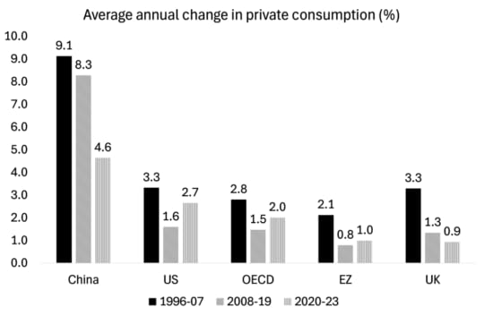 But as I showed in my review of that book and in several other posts, this thesis is nonsense. It was just not true that household consumption in China is being repressed. Actually, personal consumption in China has been increasing much faster than fixed investment in recent years (even if it is starting at a lower base) and faster than in the US or any other G7 economy. Pettis and Klein’s own empirical analysis reveals that there has been a rise in consumption as a share of GDP in China in the last ten years, even without recognising that this is a probable underestimate of the size of household consumption in the stats (which exclude many public services or the ‘social wage’).