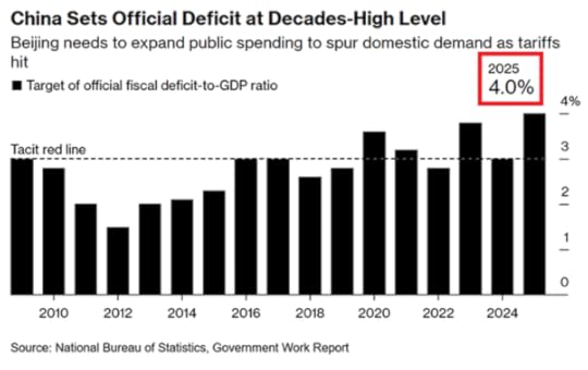 At the NPC, the Chinese leaders set the 2025 GDP growth target at “around 5%”, keeping the same pace as the prior year. Li Qiang announced plans to boost domestic demand by expanding fiscal spending. The central government will increase borrowing to do so, with the official government deficit rising to 4% of GDP, the highest ratio in 30 years.