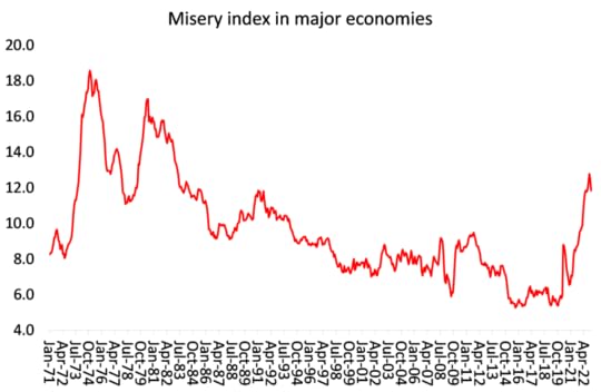 Take the global ‘Misery Index’ (an index of the unemployment rate plus the inflation rate). The impact of high inflation in 2021-2 drove up the misery index to levels globally not seen since the 1970s.