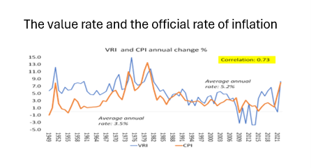 What can you conclude from this? First, our value rate of inflation is consistently higher than the official rate. That tells you that the official estimate of inflation significantly underestimates the true rate of inflation in modern economies. Second, it tells you that if the monetary authorities boost the money supply when value growth is slowing, there will be price inflation (unless the extra money does not circulate, but goes into buying financial assets or is hoarded in bank accounts, as happened in the 2010s with so-called quantitative easing).