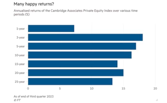 The institutional investors expect to get a better return on their money from private equity than from the stock market. CEM Benchmarking, a Canadian firm that collects data reported by $15tn worth of pension funds, endowments and other sovereign wealth funds, found that the average annual net return of private equity was 4 percentage points higher than on public equities over the past decade.