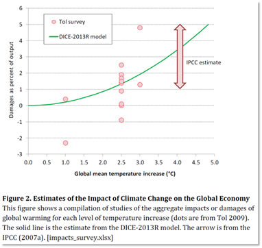 The discount rate used to calculate the likely monetary damage to economies is arbitrary. If we use a 3% discount rate, that means the current rise in global warming would lead to $5trn of economic damage (loss of GDP), but the cost in current money of global warming would be no more than $400bn, about what China spends on hi-speed rail. So, on this discount rate, global warming causes little economic damage and thus the social cost of carbon (SCC) is only about $10/ton and mitigation action can be limited. This is what Nordhaus used in his model.
