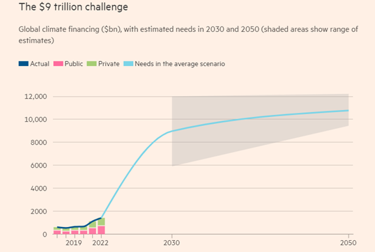 This approach is hopelessly inadequate and unworkable. The world’s clean energy plans (and they are only plans) still fall almost one-third short of what is needed to reach that figure. And to reach the necessary level of investment, climate finance will need to increase to about $9tn a year globally by 2030, up from just under $1.3tn in 2021-22, according to the Climate Policy Initiative. The $1.3trn target set by COP29 (and now not met anyway) is miles short.