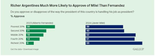 The previous Peronist administration had failed miserably to deliver on economic expansion, a stable currency and low inflation. And it also failed to deliver on ending poverty and reducing inequality. Argentina’s official poverty rate rose to 40% in the first half of 2023. According to the World Inequality Database, the top 1% of Argentines then had 26% of all net personal wealth, the top 10% had 59%, while the bottom 50% had just 5%! In incomes, the top 1% had 15%, the top 10%, 47% and the bottom 50% just 14%.