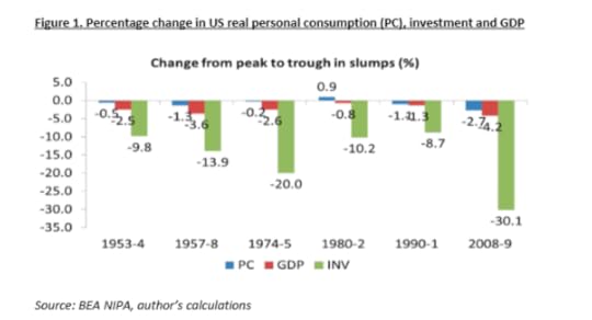 In the last six recessions since WW2, personal consumption fell less than GDP or investment on every occasion and did not even fall in 1980-2. Investment fell by 8-30% on every occasion.