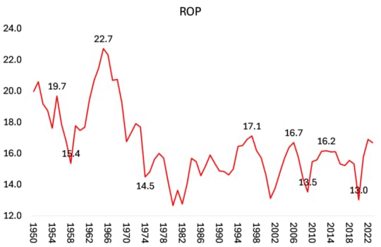 Indeed, before every major recession in post-war US, the ROP started falling in advance – as in my graph above.