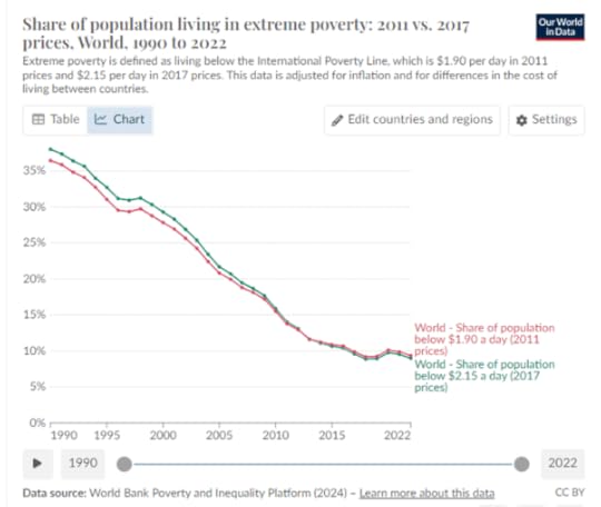 And there is another measure of poverty, the Multidimensional Poverty Index, covering 101 developing countries. This yields a poverty rate of 23% not 8%. Between 1990 and 2015, the number of people living under this line in Sub-Saharan Africa and the Middle East rose by some 140 million. So the standard of living of the world’s poorest, surviving on just half the World Bank’s austere line, has only increased a small amount in 30 years. The world is not even close to ending poverty.