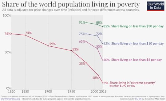 Historian Michail Moatsos produced new global dataset that goes back two centuries. According to his research three-quarters of the world lived in extreme poverty in 1820. This means they “could not afford a tiny space to live, some minimum heating capacity, and food that would not induce malnutrition.” But since then it has fallen sharply. And the share of the world population living in ‘extreme poverty’ as defined by the World Bank has never declined as rapidly as in the past three decades.