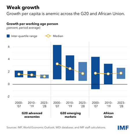 During the Long Depression of the 2010s, globalisation has fragmented along geopolitical lines—around 3,000 trade-restricting measures were imposed in 2023, nearly three times the number in 2019. Georgieva is worried: “Geoeconomic fragmentation is deepening as countries shift trade and capital flows. Climate risks are increasing and already affecting economic performance, from agricultural productivity to the reliability of transportation and the availability and cost of insurance. These risks may hold back regions with the most demographic potential, such as sub-Saharan Africa.”