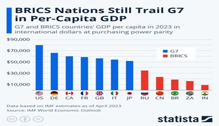 The BRICS+ group will remain a much smaller and weaker economic force than the G7 imperialist bloc. Moreover, the BRICS are very diverse in population, GDP per head, geographically and in trade composition. And the ruling elites in these countries are often at loggerheads (China v India; Brazil v Russia, Iran v Saudi). Unlike the G7, which has increasingly homogenous economic objectives under the firm hegemonic control of the US, the BRICS group is disparate in wealth and income and without any unified economic objectives – except maybe to try and move away from the economic dominance of the US and in particular, the US dollar.