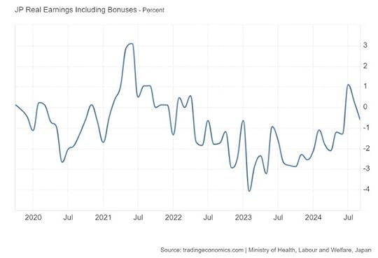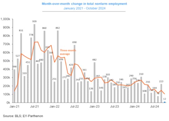 And the labour market is starting to turn for the worse. The monthly net increase in jobs has been a downward trend, with the latest October figure just +12,000 (affected partly by hurricanes and the Boeing strike).