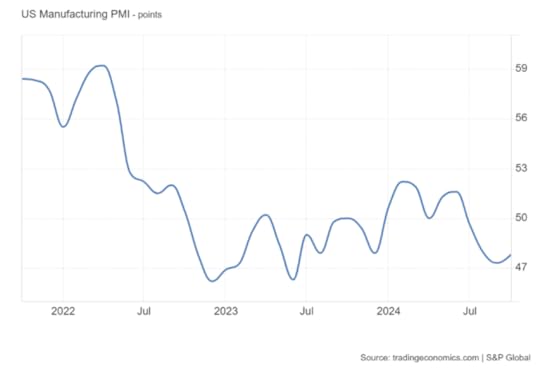 If we look at economic activity in the US manufacturing sector, based on the so-called purchasing managers survey, the index shows that US manufacturing has been contracting for four consecutive months leading up to the November election (any score below 50 means contraction).