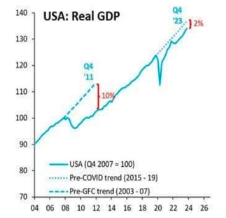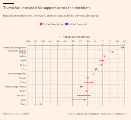 Around 40% of Americans registered to vote did not do so. And the number of Americans who failed to register rose to 19m from 12m in 2020. So, although Trump got 51% of those who voted, he actually got only 28% support of Americans of voting age. Three out of four Americans did not vote for Trump. The real winner of the election was (yet again) the ‘no vote’ party. Indeed, Trump polled fewer votes in 2024 than he did in 2020. But Harris lost around 11m votes compared to Biden in 2020.