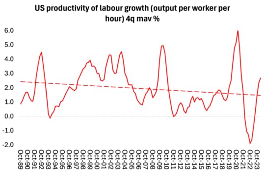 The mainstream hope that the huge subsidies pumped into the big hi-tech companies by the government will boost investment in productivity-boosting projects. In particular, the massive spending on AI will eventually deliver a sustained step-change rise in productivity growth. But that prospect remains uncertain and dubious – at least given the pace of the infusion of these new technologies across the US economy.