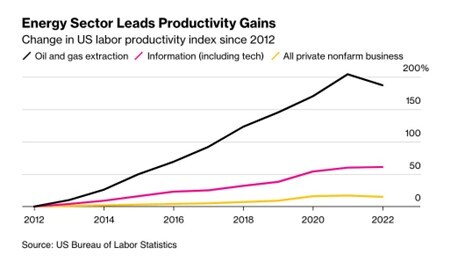 So far, productivity growth has been mainly in climate and environmentally damaging fossil fuel industry with little sign of infusion across other sectors.