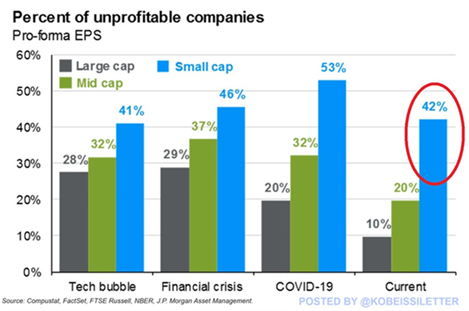 Around 42% of US small-cap companies are unprofitable, the most since the 2020 pandemic when 53% of small caps were losing money.