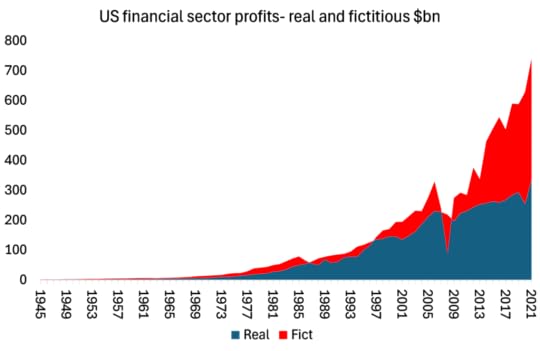 Second, much of the rise in profits is fictitious (to use Marx’s term for profits made by buying and selling financial assets that supposedly represent real assets and earnings of companies but don’t). Using the method of Jos Watterton and Murray Smith, two Canadian Marxist economists, I estimate that fictitious profits are now around half the total profits made in the financial sector. If that were to disappear in a financial crash, it would seriously damage corporate America.