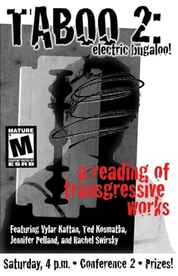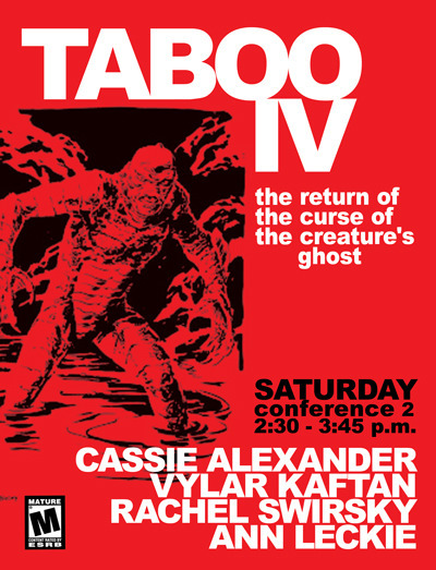 Since the splendiferous Vylar Kaftan posted this on her blog, I guess it’s safe to boost the signal here, too. She—along with the divine Jennifer Pelland and the exquisite Charlie Jane Anders—will be reading works of transgressive short fiction at Wiscon 36. As I’ve been doing the posters for the Taboo readings since the very beginning, I thought I’d post a little retrospective. Enjoy!