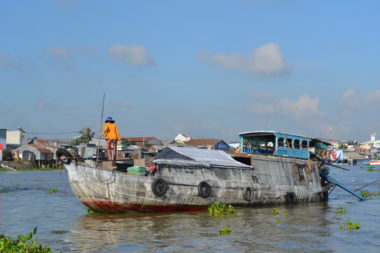 The Jahan cruised to a remote Vietnamese town, Chau Doc, where we took trishaw rides through its teeming markets, riotous with the colors of every fruit you imagine. Returning to the river, we watched the shorelines passing by, mile after mile of villages, fish farms, barges and boats, decorated with flowers to appease river spirits (in case the painted eyes on the bows didn’t work their magic). Around mid-afternoon, the ship dropped anchor at the Cambodian border. While the first officer handled customs and other formalities, I again sang for my passage in the Jahan’s lounge, delivering a lecture on my two post-war visits to Vietnam. Lighter stuff than the previous talk, and it, too, came off pretty well. It was followed by a presentation by a cultural specialist, David Brotherson. Married to a Cambodian, he’s an Australian expat who lives in Siem Reap, Cambodia. His lecture was titled, “Cambodia and Vietnam: Next Door Neighbors, Culturally Distinct.”