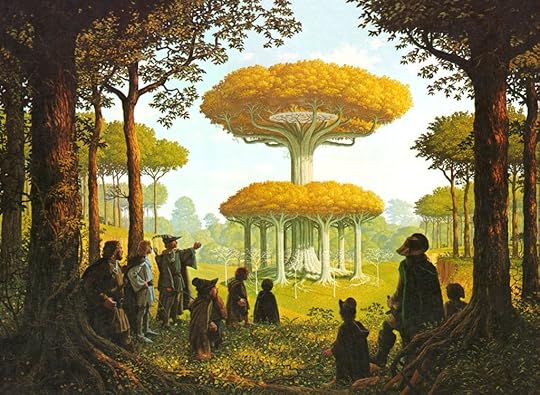 This breath of spirits and life created two powerful and fascinating beings, The Great Eagles and the Ents. Yavanna was able to work with Manwë to build a defense system into her creations, thus bringing sentience to the Great Eagles (which you’ll remember from the end of The Lord of the Rings, when Gandalf speaks with them and gets them to assist in gathering up the Hobbits) and the Ents (Yay Treebeard!) as guardians, so that even if Melkor’s influence encroaches upon the Children (both first-born, Elves and Man, and Second Born, Dwarves) and they foster a desire to mar the land further than even Melkor was able to, these sentient beings would be there for protection.