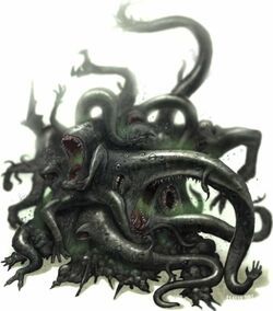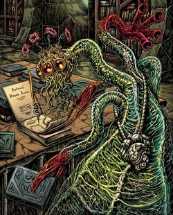 “…the Thing, which first appeared before me as an angular extension into space, with its focal point before my cousin Ambrose at the tower, became in succession a great amorphous mass of changing flesh, squamous as certain snakes, and putting forth and drawing back constantly and without cessation innumerable tentacular appendages of all lengths and shapes; a horrible, blackly furred thing with great red eyes that opened from all portions of its body; a hellish monstrosity which was octopoid in seeming to have become a small, shrivelled mass of torso with tentacles hundreds of times its size and weight which whipped backward in a fanning motion into space, and the ends of which were literally sloughed or melted away into distance, while the empurpled body opened a great eye to look upon my cousin, and disclosed beneath it a great pit of mouth from which issued a terrible, if muted, screaming...”