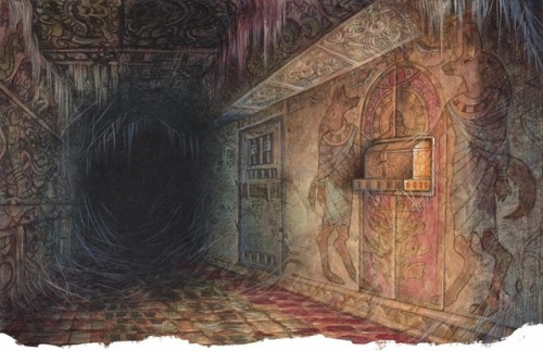 He then takes the book and flees, but makes a critical mistake, “Just as I blindly crossed the summit, unprepared for the sudden dip ahead, my feet slipped utterly and I found myself involved in a mangling avalanche of sliding masonry whose cannon-loud uproar split the black cavern air in a deafening series of earth shaking reverberations.”