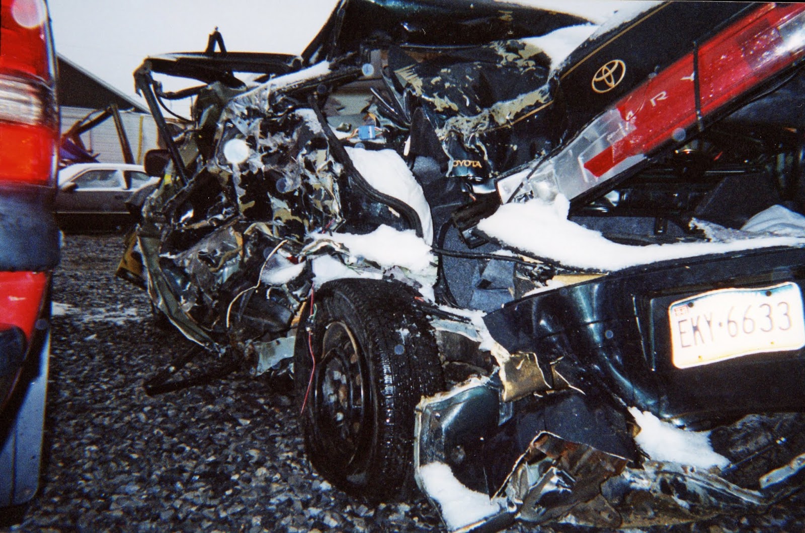 Our car after the crash in 2003I'm not sure a person ever quite gets over the panic, the stress, and the trepidation that follows trauma. Nearly sixteen years after breaking my neck in a turnpike pile-up,* I'm relatively calm about driving in good conditions (well, most days), but the fear of fog, slippery roads, heavy rain, and snow still ties me up in knots. I have friends who choose not to drive (or ride) on the freeway at all. I understand. I know firsthand what can happen.