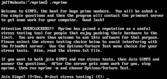 I've been using Prime95 and MPrime – tools that attempt to rip through as many giant numbers as fast as possible to determine if they are prime – for the last 15 years. Here's how to download and install mprime on that fresh new Ubuntu Server system you just booted up.