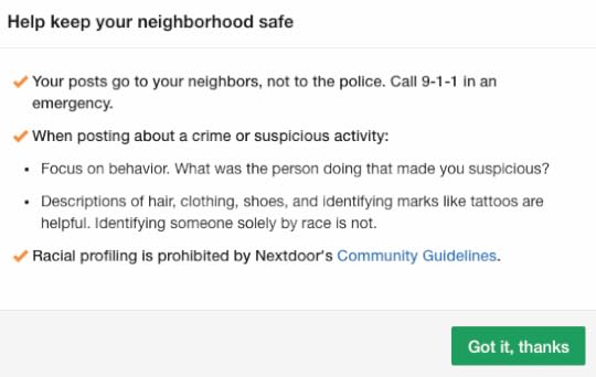 I don't use Nextdoor myself, but I remember Betsy specifically complaining about the casual racism she saw there, and I've also seen it mentioned several times on Twitter by people I follow. They're not the only ones. It became so epidemic that Nextdoor got a reputation for being a racial profiling hub. Which is … not good.