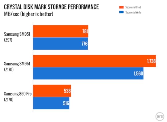 That's respectable SSD performance and won't hold you back in most use cases, but it's not a barn-burning disk subsystem, either. I'm not entirely sure retrofitting, say, the state of the art Samsung 950 Pro M.2 2280 drive is possible due to length restrictions.