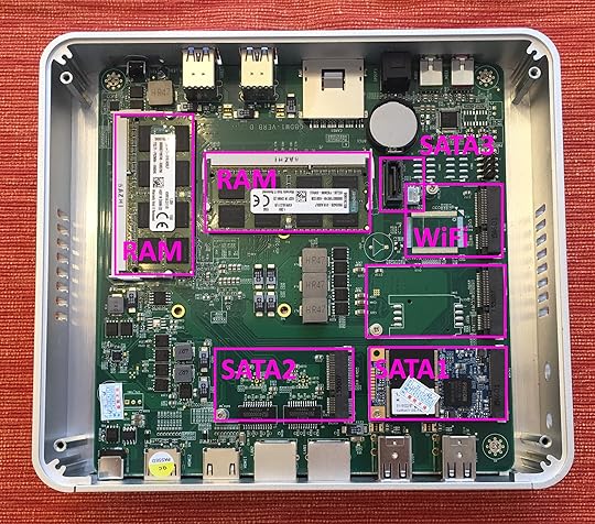 The machine has M.2 slots for two drives, as well as a SATA port and power cable (not pictured, but was included in the box) if you want to mate a 2.5" drive with the drive mounting holes on the bottom of the case. So if you prefer a mirrored two drive RAID array here for reliability, or a giant honking 2TB 2.5" HDD slapped in there for media storage, all of that is possible!