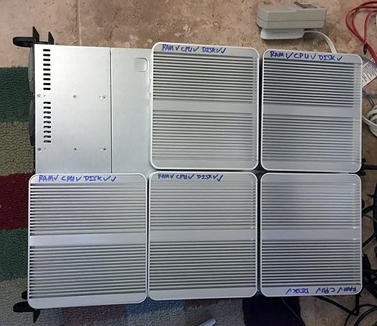 (Well, except for the power bricks and cables. Vertical mounting on a 1U shelf works out a bit better, and each conveniently came with a stand for vertical operation.)