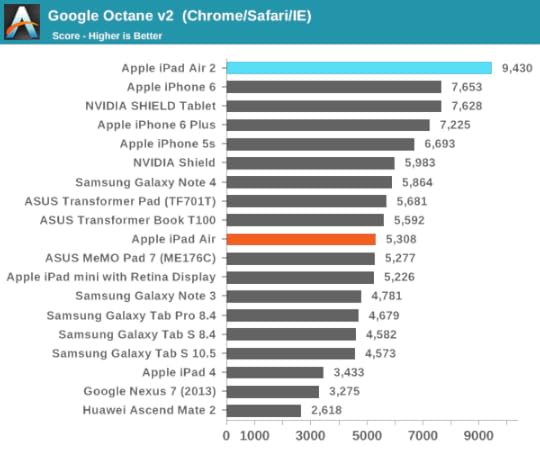 It's so fast I sometimes forget I'm not using my Surface Pro 3 with its 4GB RAM and Core i5 CPU. I get hassled when I bring my Surface to meetings, but I patiently explain that it's a very nice third gen hardware design with a fully integrated keyboard cover, IE11 is a great touch browser, and that I'm mostly using the device as a tablet, as a sneak preview of what iPad 8 performance will look like. Based on today's benchmarks with the iPad Air 2 – chronologically, the iPad "6" – I believe that's about right.