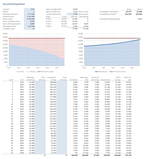 Bereken met dit sjabloon de gemiddelde netto maandlasten als je kiest voor een lineaire hypotheek. Je kunt een deel van de lening ook aflossingsvrij maken. Tussentijdse aflossingen worden direct doorgerekend. Met een lineaire hypotheek dalen de maandlasten. De aflossing is lineair (iedere maand gelijk). Dan daalt iedere maand de rentelast een klein beetje. Berekening per maand.