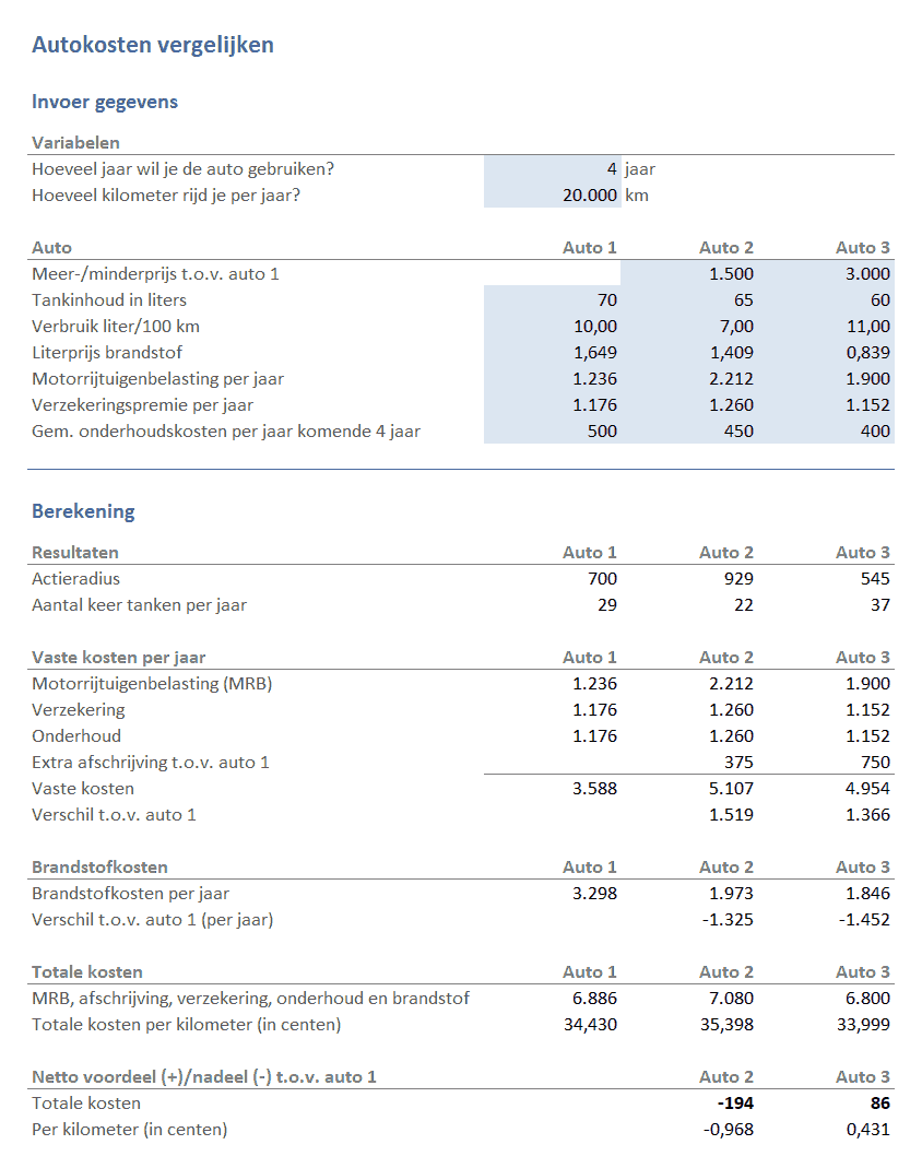 Vergelijk met deze template tot 3 auto’s met elkaar. Welke auto is goedkoper als je kijkt naar de vaste en variabele kosten per jaar of per kilometer?