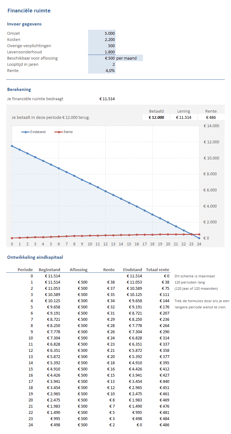 Bereken hoeveel geld je kunt lenen als je weet wat je maandelijks overhoudt, hoe hoog de rente is en wat de looptijd is. Bijvoorbeeld: Je hebt nieuwe bestelbus nodig. De investering bedraagt € 12.000. Hoeveel financiële ruimte heb je dan om daar geld voor te lenen? In dit voorbeeld kun je dus niet genoeg lenen. Je moet of zelf geld bijleggen, of kosten besparen, of een langere looptijd kiezen, of een lagere rente zien te krijgen.