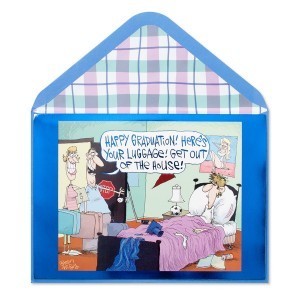 I have a niece and a nephew graduating college this year and another niece and a God son graduating high school. That not only puts me on the hook for a fairly sizable chunk of change (thank you to our sibs for having a collective 10 children, by the way….Love them all madly!!!!) but four graduation cards. So off I went to Papyrus, which is based right here in the Bay Area, to see what I could find. There were a number of neutral cards (though the overuse of the word "awesome"–as in "I think therefore I am….AWESOME!" put me off so there was no way I'd by them). A certain number of pink cards because I this generation of graduates would be at the front end of the pink-is-the-only-color-girls-could-possibly-ever-want wave. Obviously, I wan't going to buy those. But here's what really got me: all the cards with pictures of actual PEOPLE on them showed males. Now, I see on their web site that there was ONE retro-looking card with a male and a female in cap and gown, but it wasn't in either of the TWO stores in Berkeley I went to. So if I wanted to buy my nieces cards with people on them, they would have to feature guys. They probably wouldn't notice, because they're probably, as females, used to the universal male. This was ESPECIALLY true for funny, slightly insulting cards like this one: