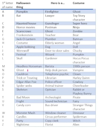 Using the chart below, take the first letter of your name (first name or last name), and use the hero and costume (the hero does not have to wear the costume) in the same row. Or be a rebel and pick any of the three you choose. However, you must use a Halloween thing, a hero from the table, and one of the costumes – in any order you choose.